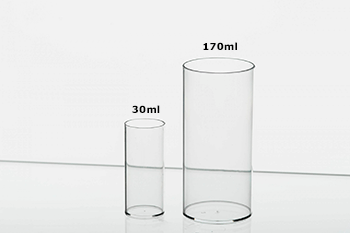Für die Form setzen wir aus Gründen der platzeffizienten Aufbewahrung und Lieferung auf zylinderförmige Zuchtbehälter mit einem Volumen von entweder 30ml oder 170ml.